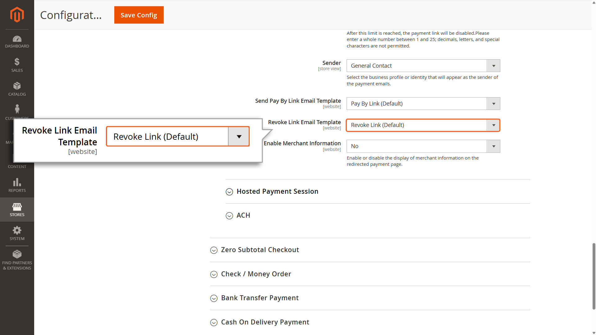 Revoke Link Email Template: Choose the pre-formatted email layout sent to the customer if the payment link is manually cancelled or expires.The default template is pre-selected.