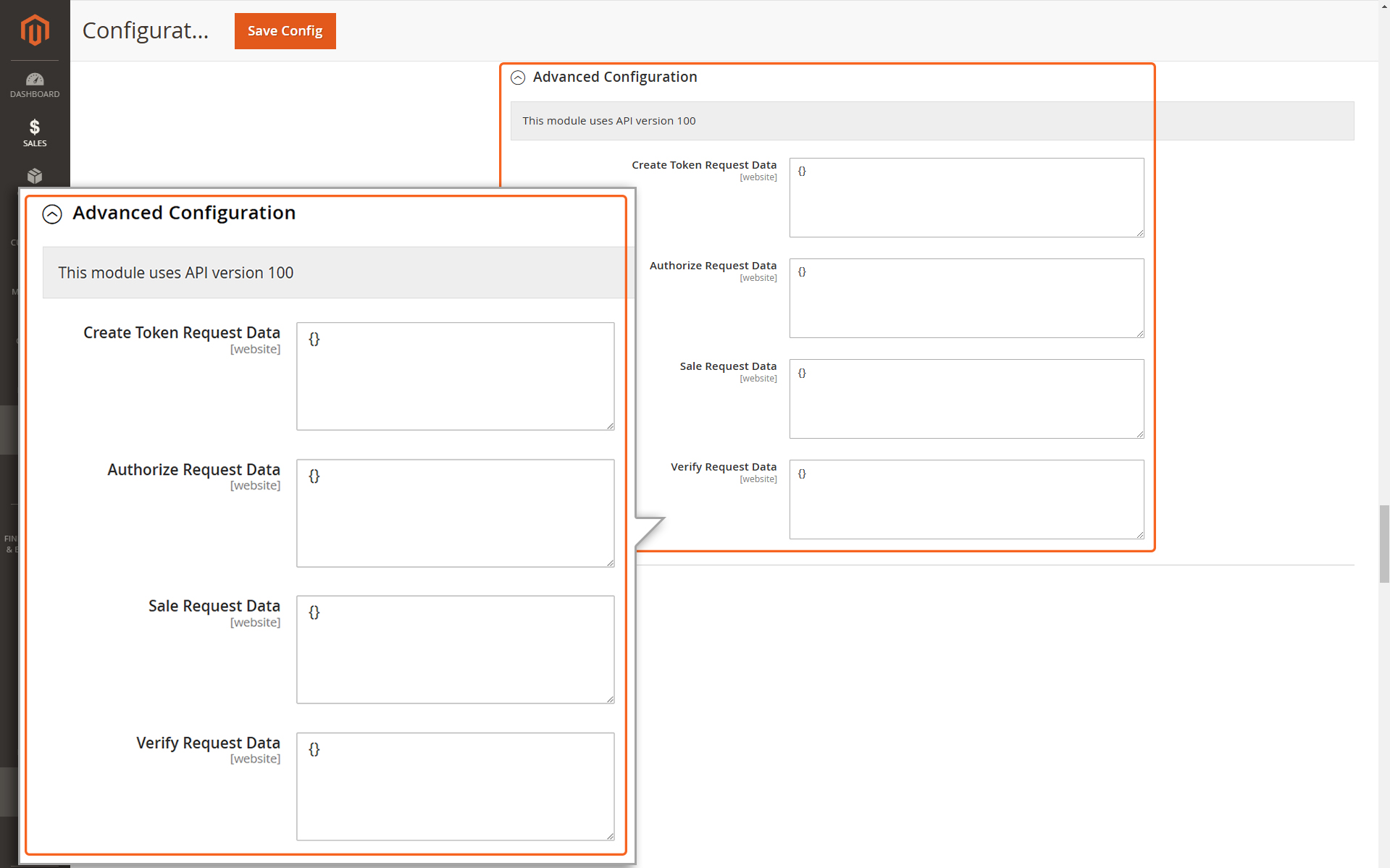 In the Advanced configuration section, you can find information about the current API version utilized by the Mastercard Gateway plugin. Additionally, there is a field available to Create Token Request Data, Authorize Request Data, Sale Request Data & Verify Request Data.