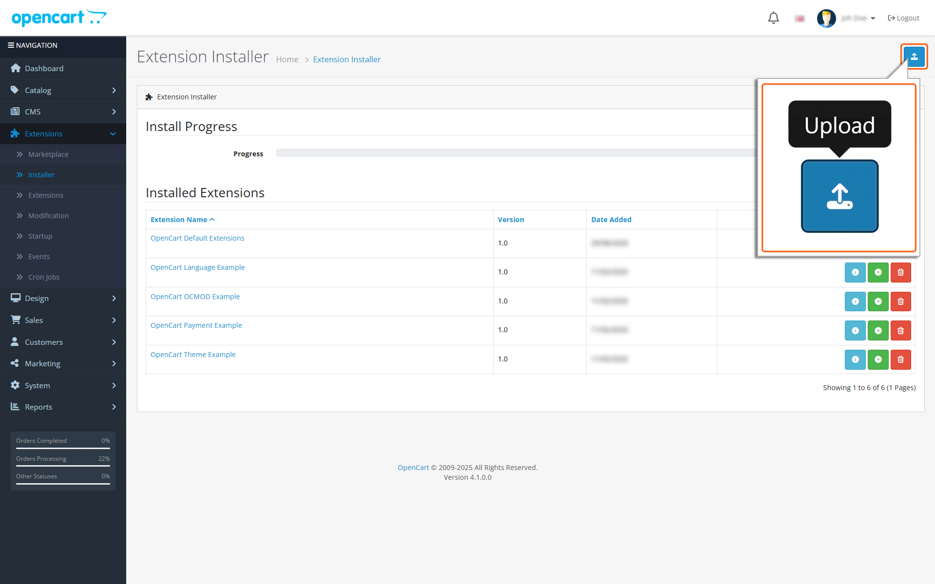 - Select the previously downloaded, ‘mastercard.ocmod.zip’ file and upload it. Once uploaded successfully, it will appear on the Installer page.