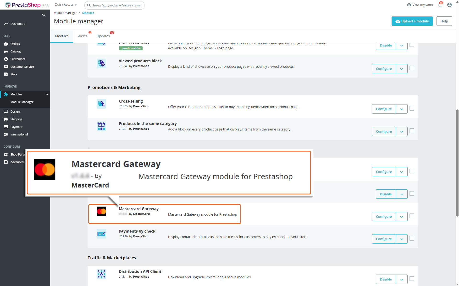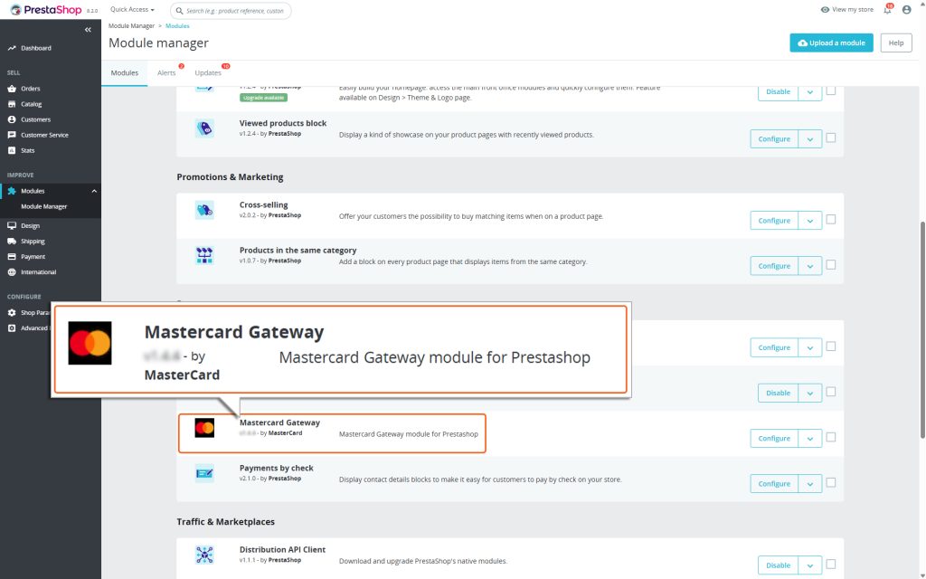 Select the previously downloaded ‘prestashop-mastercard.zip’ file and upload it. Once uploaded successfully, it will appear on the Module Manager page under the Payment Category.