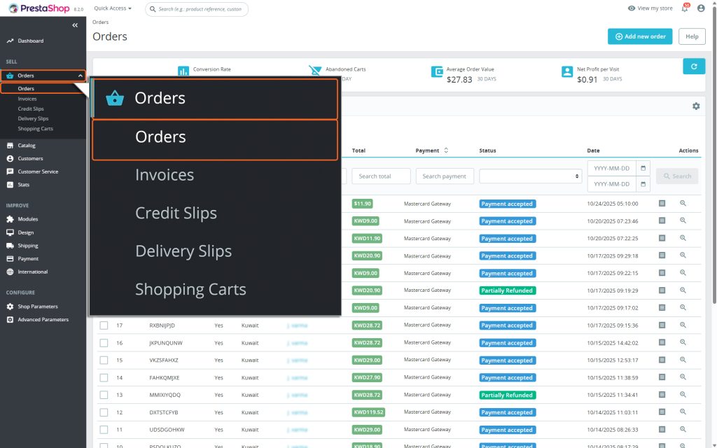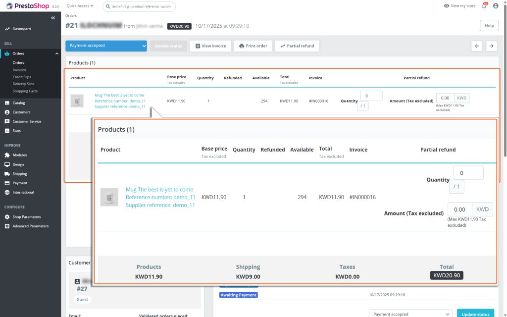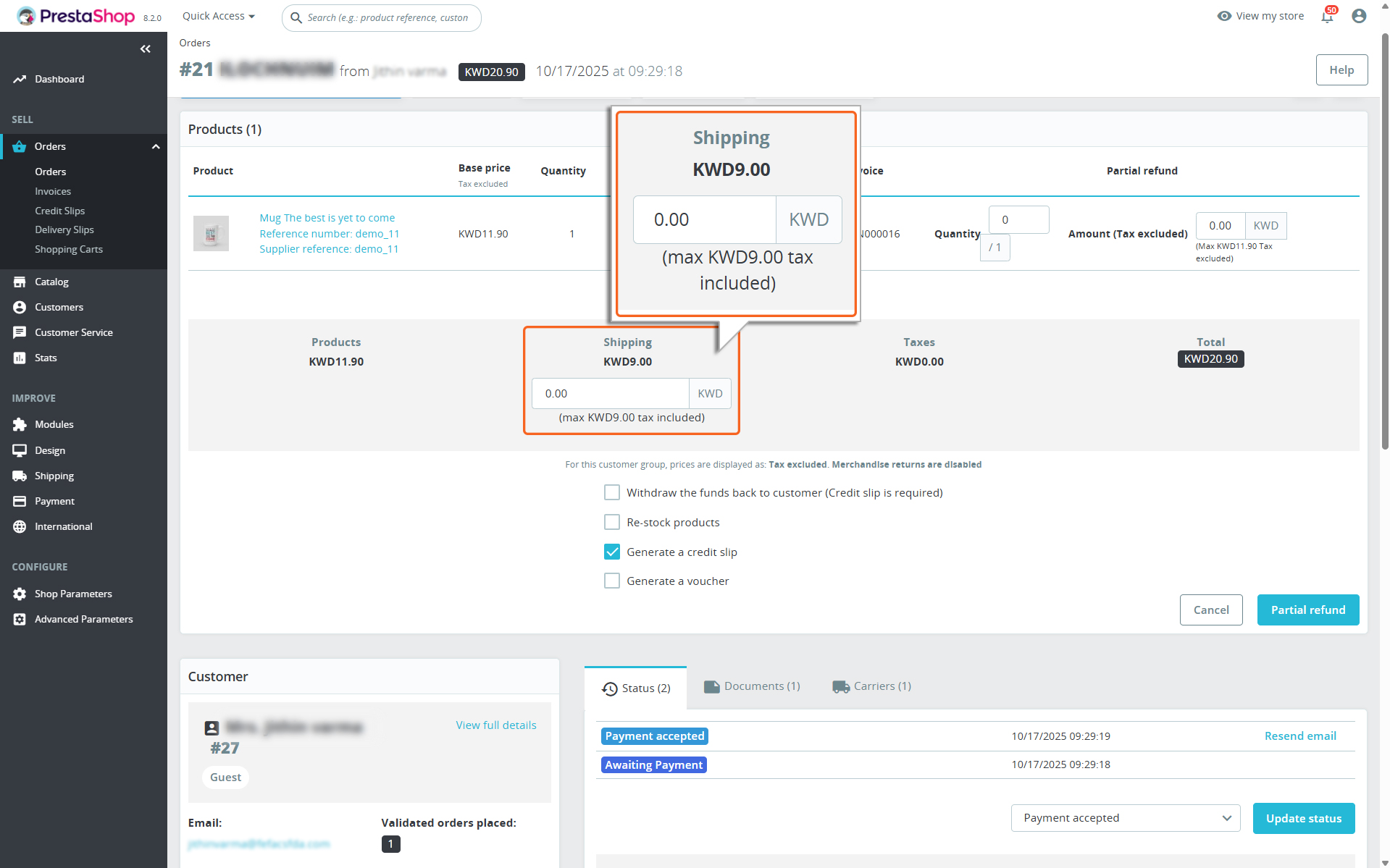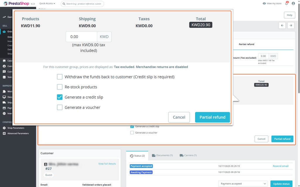 In PrestaShop, you can only initiate a partial refund after the amount has been captured for the order (For guidance on capturing an amount, please click here). Here’s a step-by-step guide to issuing a partial refund using the PrestaShop admin panel: