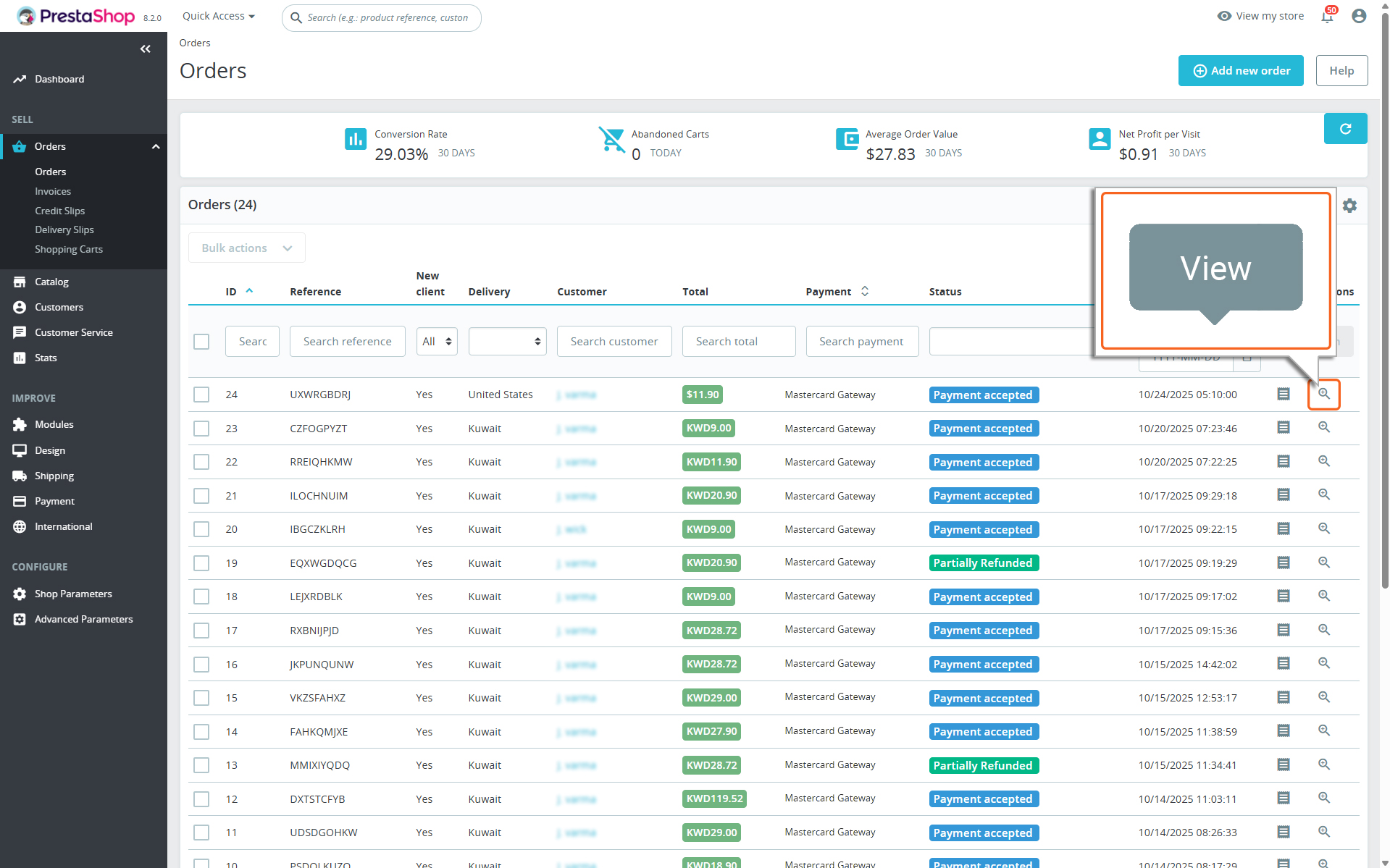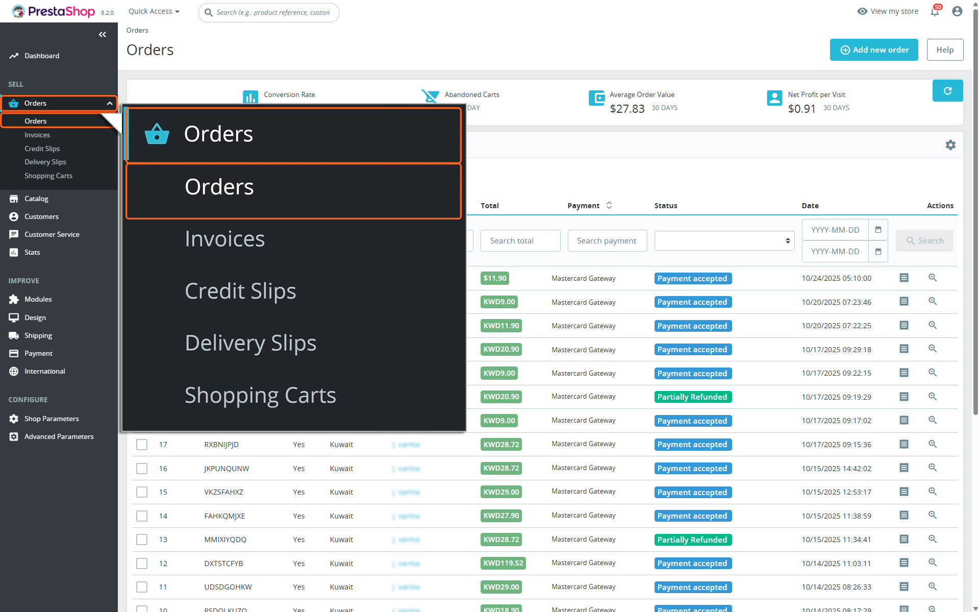 • Go to the Orders section in the PrestaShop Admin Panel.