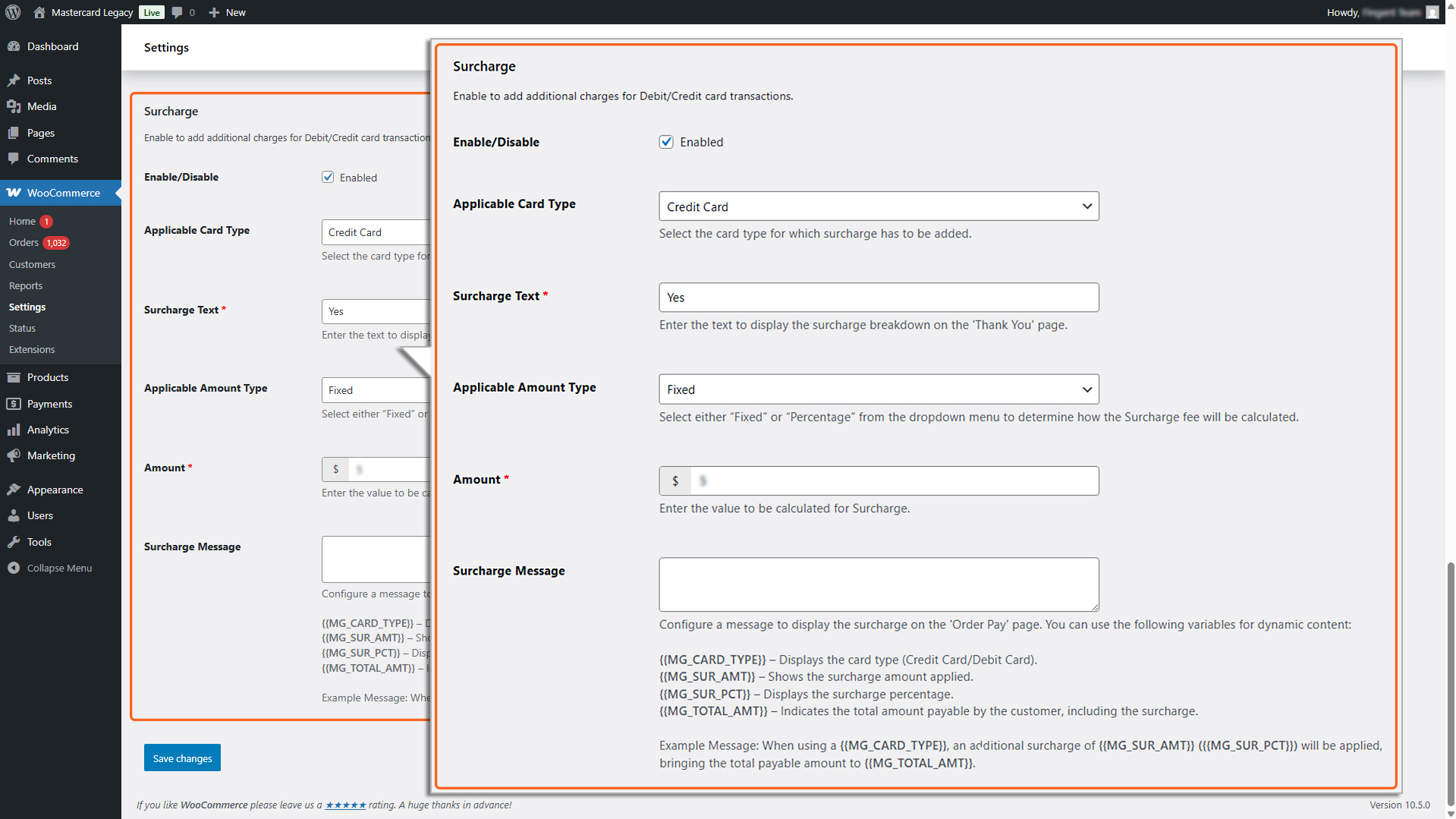 - Surcharge Message: Configure a message to display the surcharge on the ‘Order Pay’ page. You can use the following variables for dynamic content: